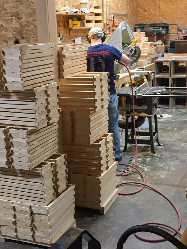 Bruce Collins and a wall of freshly built nuc boxes. View fullsize